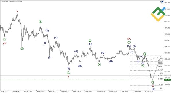 Для ETHUSD характерна формирование крупного восходящего зигзага (A)-(B)-(C) в долгосрочной перспективе. Импульсная волна (A) завершена, сейчас рынок проходит через многоступенчатую коррекцию (B), структурированную как тройной зигзаг W-X-Y-XX-Z. Недавно завершились волна Y и боковая связка XX (двойная тройка), что открывает путь для финального снижения в волне Z.