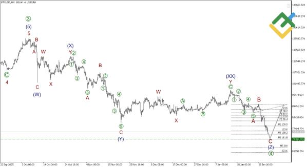 На четырехчасовом графике BTCUSD завершилась импульсная волна [3] восходящего цикла. Текущее снижение интерпретируется как коррекционная волна [4], развивающаяся по сценарию тройного зигзага (W)-(X)-(Y)-(XX)-(Z). Последовательно завершились структуры (Y) и волна-связка (XX) в форме двойного зигзага. Фокус внимания смещается на финальную компоненту — волну (Z), которая, вероятнее всего, примет классическую форму зигзага A-B-C.