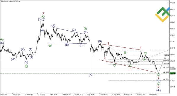 Глобальная структура XRPUSD сохраняет бычий потенциал в рамках импульса (1)-(2)-(3)-(4)-(5). Однако текущая фаза представляет собой развитую коррекцию (4) в форме двойного зигзага W-X-Y. Внутри завершающей волны Y формируется еще один двойной зигзаг [W]-[X]-[Y], где активно развивается медвежья компонента (С).