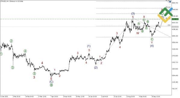 На H4 формируется завершающая волна [C] в структуре двойного зигзага W-X-Y. Ожидаемый максимум — 4910.16, что соответствует 38.2% расширению Фибоначчи от волны (3).