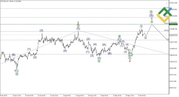 На 4-часовом графике завершается формирование волны 5 в структуре 1-2-3-4-5. Коррекция 4 уже прошла в виде классического зигзага. Ожидаемый рост — до 129 000 USD.