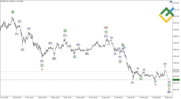 В данный момент мы находимся в финальной стадии волны Z. На последнем участке графика четко идентифицируется завершенная коррекция (4) of [C] в форме двойной тройки W-X-Y. Это означает, что накоплен потенциал для начала финального снижения. Торговые сигналы по Эфириуму на сегодня рекомендуют рассматривать открытие коротких позиций с целью у уровню 1793.67, где, согласно структуре волн, должна завершиться подволна (5).