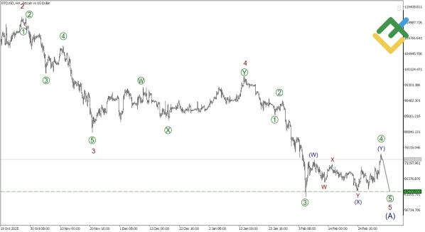 На часовых интервалах видно, что коррекция [4] of 5, принявшая форму сложной фигуры «двойная тройка», подошла к концу. Это подтверждается снижением объемов и отсутствием сильного покупательского интереса после недавнего отскока. Мы ожидаем возобновление нисходящего тренда в подволне [5] of 5. Ближайшая цель для краткосрочного прогноза по Биткоину — уровень 62400.00, где, вероятно, будет зафиксирована прибыль по коротким позициям.