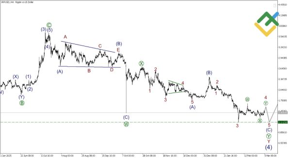 Волновой анализ Рипл на сегодняшней сессии указывает на продолжение коррекционной фазы в рамках бычьего импульса (1)-(2)-(3)-(4)-(5). Крупная коррекция (4) усложняется и принимает форму двойного зигзага W-X-Y. Внутри волны Y, которая сейчас активно формируется, мы видим развитие конечной действующей волны [Y] в виде двойного зигзага.