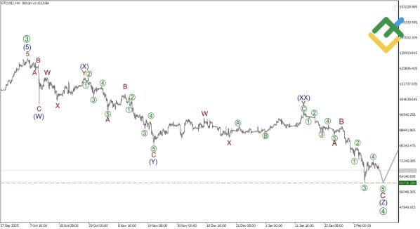 На 4-часовом таймфрейме импульс [3] завершён, коррекция [4] принимает сложную форму тройного зигзага. Волны (Y) и соединительная (XX) уже сформированы в виде двойных зигзагов. Сейчас строится зигзаг (Z) с внутренней импульсной структурой A-B-C, где C требует подволны [5] вниз. Ожидаемое снижение к ключевому уровню 60 736 (цель волны C).
