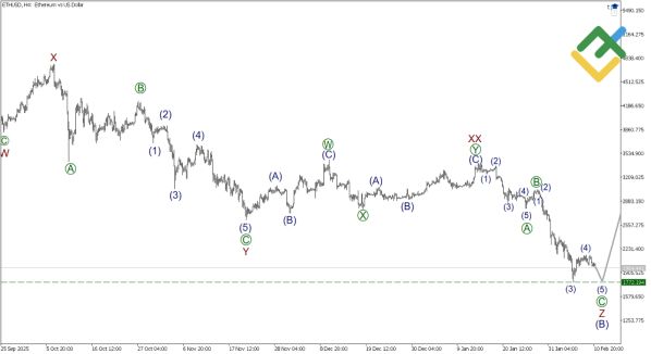 - ETHUSD — финальная волна Z тройного зигзага в коррекции (B) крупного зигзага (A)-(B)-(C), минимум — 1 772.