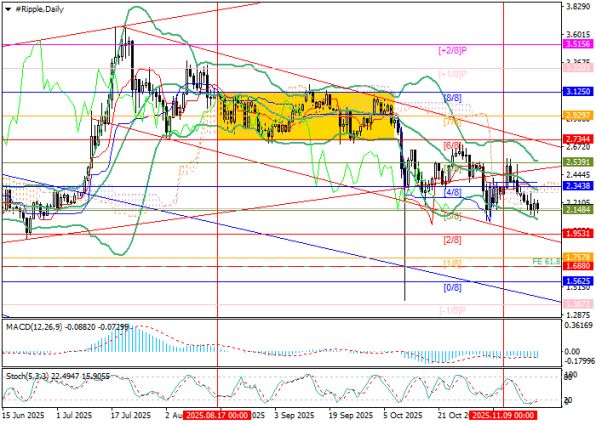 Сопротивление в ближайшей перспективе находится на отметке 2.5391 (уровень Мюррея [5/8]). Только уверенный пробой и закрепление выше этого значения могут инициировать попытку смены тренда с выходом из канала вверх. В таком случае потенциальные цели — 3.1250 ([8/8] по Мюррею) и 3.5156 ([+2/8]). Тем не менее, на фоне общей слабости крипторынка и негативной макроэкономической обстановки, такой сценарий считается маловероятным в краткосрочной перспективе.