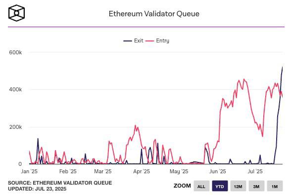 Сеть Ethereum столкнулась с беспрецедентной с начала года нагрузкой: в очереди на вывод средств из стейкинга скопилось свыше 600 000 ETH, что эквивалентно примерно $2 миллиардам. Этот объем составляет значительные 1.5% от всего застейканного ETH. Интересно, что всплеск активности по выводу совпал с впечатляющим ростом курса второй по капитализации криптовалюты: ETH прибавил более 50% с июля и демонстрирует рост около 160% от минимумов, зафиксированных в апреле.