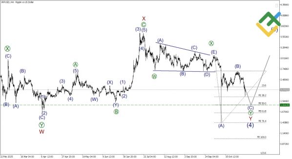 По Ripple (XRP) на текущем этапе реализуется структура четвёртой волны (4) в контексте глобального бычьего импульса. Эта коррекция принимает форму двойного зигзага W-X-Y. Волны W и X уже завершены, а структура Y развивается как зигзаг меньшего уровня [A]-[B]-[C].