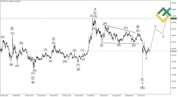 Для XRPUSD также характерна чёткая волновая структура. На глобальном уровне формируется завершающая фаза бычьего цикла (1)-(2)-(3)-(4)-(5). Четвёртая волна, скорее всего, завершилась в виде сложной коррекции — двойной тройки W-X-Y. Сейчас развивается пятая волна, в рамках которой цена может достичь предыдущего локального максимума 3.643 USD.