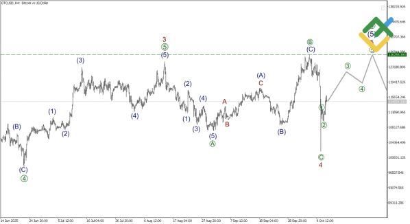 В настоящий момент биткоин формирует завершающую фазу импульсной волны. По краткосрочному прогнозу BTCUSD, оптимальной является стратегия покупки (Buy) с ориентиром на область исторического максимума 126255.39126255.39. На четырёхчасовом графике отчётливо просматривается завершённая волна-коррекция [A]-[B]-[C] и формирование финальной пятой подволны.