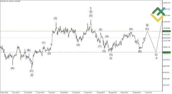 На 4-часовом графике Bitcoin, вероятно, завершает сложная коррекционная волна [B] в рамках более крупного восходящего импульса. Все указывает на скорое начало заключительной импульсной волны (C), которая может привести цену к отметке 118 065.86.