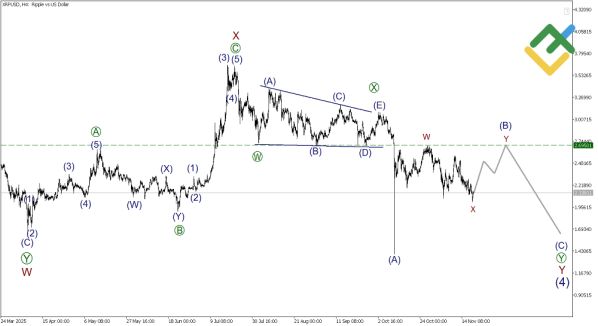 По XRPUSD формируется глобальный бычий импульс, однако рынок сейчас находится в стадии завершения коррекционной волны (4). Эта волна принимает форму двойного зигзага W-X-Y. На данный момент завершены подструктуры W и X, а волна Y развивается как ещё один двойной зигзаг [W]-[X]-[Y]. Внутри неё завершена импульсная подволна (A), сейчас формируется боковая коррекция (B), вероятно, тоже в виде двойного зигзага.