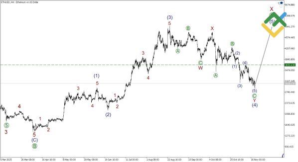 На H4-графике ETHUSD завершается крупная коррекция в виде двойного зигзага W-X-Y. В данный момент развивается волна-связка X, которая может быть зигзагом [A]-[B]-[C]. Внутри неё уже сформированы импульс [A] и коррекция [B], а сейчас идёт построение волны [C]. В рамках этой структуры завершены подволны (1)–(4), и формируется начальная часть подволны (5), что открывает потенциал роста до 3650,41 USD.