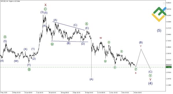 Для Ripple (XRPUSD) на горизонте H4 прослеживается классическая структура бычьего импульса (1)–(5). В данный момент завершается коррекционная волна (4), которая принимает форму двойного зигзага W–X–Y.
