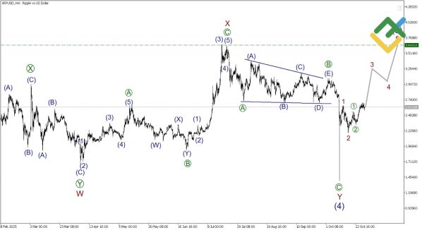 Анализ XRPUSD указывает на формирование глобального бычьего импульса (1)-(2)-(3)-(4)-(5). Коррекция (4), завершившаяся недавно, имеет структуру двойной тройки W-X-Y — сложной, но типичной для крипторынка модели.
