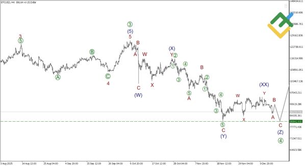 Недавно завершились подволны (Y) и корректирующая структура (XX), представленная двойным зигзагом W-X-Y. На текущем этапе рынок входит в начальную фазу волны (Z) — завершающего элемента коррекции. С учётом структуры предыдущих подволн, наиболее вероятная цель для медвежьего движения — уровень 80 842,00, ранее достигнутый подволной (Y).