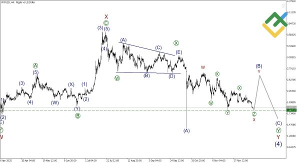 Анализируя XRP/USD, можно заметить, что в долгосрочной перспективе формируется восходящий импульс (1)-(2)-(3)-(4)-(5). Однако на текущем этапе рынок находится в коррекционной волне (4), которая развивается как двойной зигзаг W-X-Y.