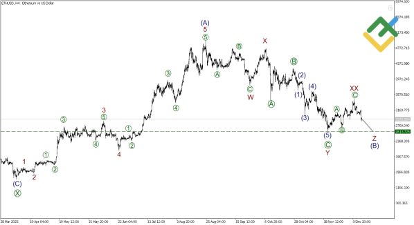 На H4-графике ETH/USD формируется крупный восходящий зигзаг (A)-(B)-(C). Импульсная волна (A) уже завершена, и в данный момент рынок корректируется в рамках волны (B), которая развивается как тройной зигзаг W-X-Y-XX-Z.