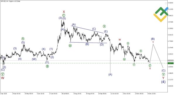 На графике XRPUSD в долгосрочной перспективе сохраняется бычий импульс (1)-(2)-(3)-(4)-(5). Однако текущая фаза — это коррекционная волна (4), имеющая форму двойного зигзага W-X-Y.