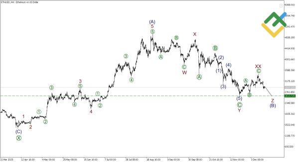 Подволны Y и XX уже завершены: последняя из них — в виде классического зигзага [A]-[B]-[C]. Сейчас рынок вступает в финальную фазу — волну Z, которая, по прогнозу, направит цену к 2613.72, совпадающему с минимумом предыдущей подволны Y.