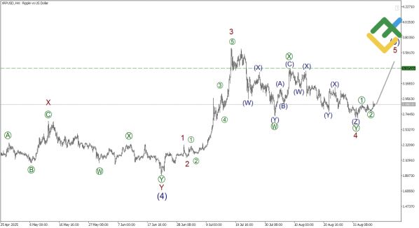 XRPUSD: формирование бычьего импульса (1)-(2)-(3)-(4)-(5). Ожидается рост в финальной подволне 5 в направлении предыдущего максимума 3,375. Рекомендуется рассмотреть длинные позиции с целью на 3,375.