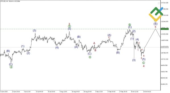 На четырехчасовом таймфрейме (H4) для Биткоина явно прослеживается структура импульсной волны 1-2-3-4-5. Коррекционная волна [4], судя по всему, уже завершила свое формирование, приняв форму классического зигзага [A]-[B]-[C]. В настоящий момент цена, вероятно, строит начальную стадию импульсной подволны [5]. Это сигнализирует о высокой вероятности продолжения роста в направлении ключевого уровня сопротивления, расположенного на отметке $126 000. Данная цена является не только психологической вехой, но и значимым техническим уровнем, где ранее завершилась боковая коррекция [B].