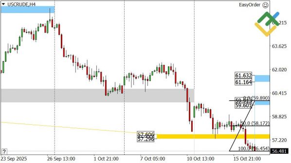 16 октября цена на нефть марки WTI закрепилась ниже ключевой «Золотой зоны» 57.60–57.29, что подтверждает смену краткосрочного настроения в пользу продавцов. Рынок отреагировал на укрепление доллара и данные по запасам нефти в США, которые оказались выше ожиданий.
