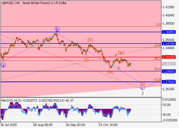 Если наша интерпретация волнового анализа верна, то пара GBP/USD ожидаемо возобновит снижение. Целевым коридором для движения вниз является обширная зона в районе 1.2950–1.2750. Данные уровни являются сильными техническими поддержками, где давление продавцов может ослабнуть.