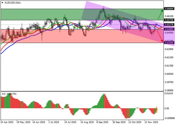 На дневном графике AUD/USD отскакивает от нижней границы нисходящего канала с динамическими границами 0.6350–0.6530. Индикатор Alligator демонстрирует формирование восходящего импульса: быстрые ЕМА направлены вверх и приближаются к сигнальной линии. Параллельно гистограмма Awesome Oscillator формирует серию восходящих баров в отрицательной зоне, что может указывать на скорый разворот вверх.