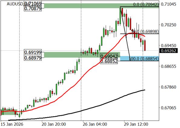Пара AUD/USD развернулась вниз после обновления годового максимума в районе 0.7094, что стало следствием фиксации прибыли и ребалансировки портфелей в пользу защитных и высоколиквидных активов, включая американский доллар. Усиление спроса на USD поддерживается ожиданиями сохранения жёсткой политики ФРС: по данным CME FedWatch Tool, вероятность сохранения ставки в диапазоне 3,50–3,75% на ближайшем заседании оценивается рынком выше 90%, тогда как месяц назад сценарий сохранения политики воспринимался менее однозначно. Индекс доллара (DXY), ранее обновивший минимум 2025 года, сумел частично восстановить позиции и завершил последнюю неделю умеренным ростом, что дополнительно оказывает давление на риск‑чувствительные валюты, включая австралийский доллар.
