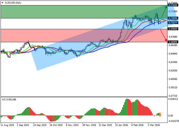 На дневном графике инструмент удерживается несколько выше линии поддержки восходящего канала с динамическими границами 0.7300–0.6900. Согласно данным технического анализа, ключевая поддержка находится на уровне 0.6900–0.6945, а сопротивление — в зоне 0.7080–0.7115 .