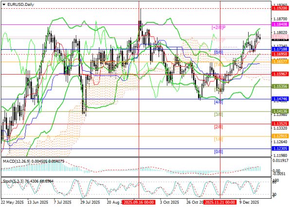 Пара EUR/USD второй месяц подряд торгуется с преобладанием бычьих настроений, удерживаясь в районе 1.1770–1.1780, что соответствует зоне расширения восходящего диапазона и уровню Мюррея [+1/8]. Активность участников снижается из‑за рождественских праздников, поэтому короткие импульсы могут усиливаться на тонком рынке и приводить к ложным пробоям уровней.