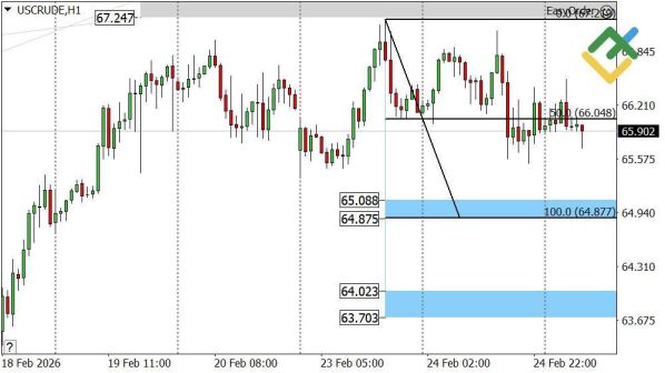 Нефть (USCrude) — цена снижается к поддержке A 65.08–64.87.