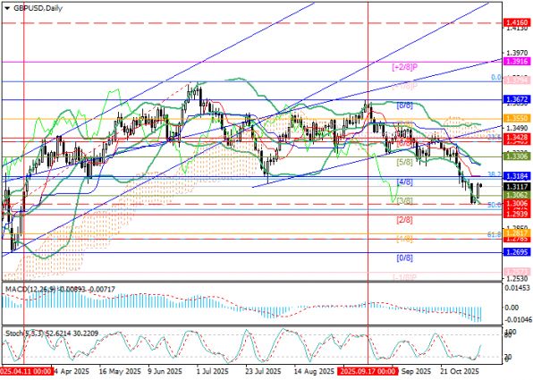 На недельном таймфрейме пара GBP/USD остаётся в рамках устойчивого нисходящего тренда, длящегося уже третий месяц подряд. Недавнее отскок от 1.3006 выглядит как техническая коррекция, а не разворот тенденции.