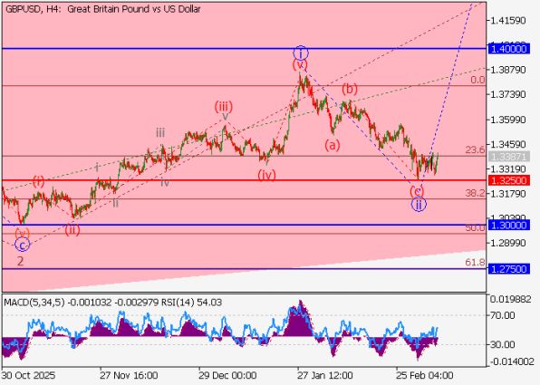 Переходя к четырехчасовому графику, видим, что волна i of 3 построена, а коррекция ii of 3 завершена. Если эта интерпретация верна, то в рамках волны iii of 3 пара GBP/USD может достичь зоны 1.4000–1.4350. Ключевой уровень для отмены этого сценария — пробой 1.3250, который выступает в роли стоп-лосса. Уровни поддержки и сопротивления здесь играют решающую роль: прорыв вверх подтвердит бычий импульс, в то время как снижение ниже критической отметки активирует медвежий сценарий.