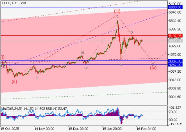 Золото (XAU/USD) продолжает торговаться в фазе коррекции после обновления локальных максимумов, при этом вероятность возобновления снижения остаётся повышенной. На дневном графике сохраняется структура восходящего тренда в формате третьей волны старшего уровня 3 of (5), внутри которой развивается заключительная волна v of 3 по методике волнового анализа Эллиотта. На четырёхчасовом таймфрейме уже сформировалась импульсная третья волна младшего порядка (iii) of v, а рынок отрабатывает коррекцию в виде четвёртой волны (iv) of v, где формируется нисходящая волна c of (iv). При сохранении текущей структуры давление продавцов по XAU/USD может усилиться и спровоцировать движение котировок в область 4387.30–4267.20, тогда как ключевым уровнем для защитных ордеров (Stop Loss) в рамках базового сценария остаётся отметка 5137.95.