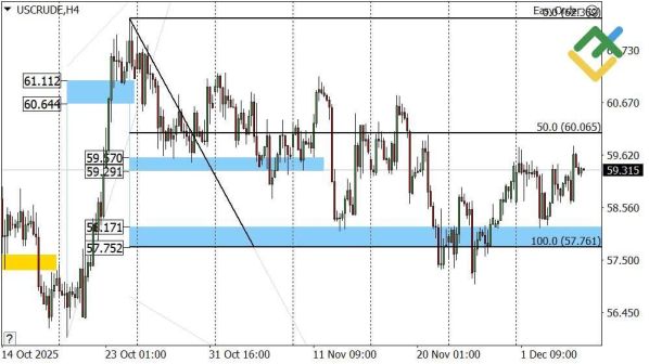 Однако следует учитывать риски. Если цена пробьёт вниз зону поддержки B (58.17–57.75), это может спровоцировать смену тренда на нисходящий. В таком сценарии ожидается продолжение коррекции до целевой зоны 53.97–53.13, где можно будет рассматривать длинные позиции.