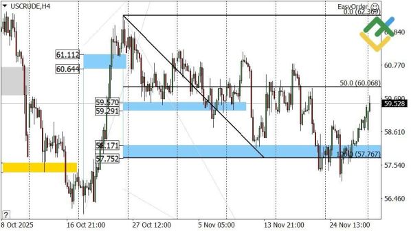 Тем не менее, важно учитывать альтернативный сценарий: если цена закрепится ниже границы поддержки 57.75, это может сигнализировать о смене тренда на нисходящий. В таком случае уже со 2 декабря можно будет рассматривать продажи с ориентиром на нижнюю целевую зону 53.97–53.13.