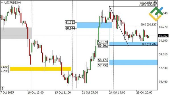 На текущей неделе цена на нефть марки US Crude скорректировалась вниз и протестировала зону поддержки (А) 59,29–59,57. Эта область демонстрирует устойчивость: покупатели активно защищают уровень, что создаёт благоприятные условия для открытия длинных позиций.