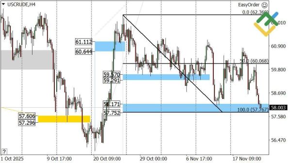 Котировки «черного золота» вновь приблизились к значимому уровню поддержки в диапазоне 58.17 – 57.75. С точки зрения анализа маржинальных зон, эта область является ключевым рубежом, где сосредоточены интересы покупателей. Удержание данной зоны и формирование ценового отскока откроет путь для возобновления восходящей коррекции. В таком сценарии первая цель для покупателей будет находиться на сопротивлении 60.06, а следующая — в районе 62.36.