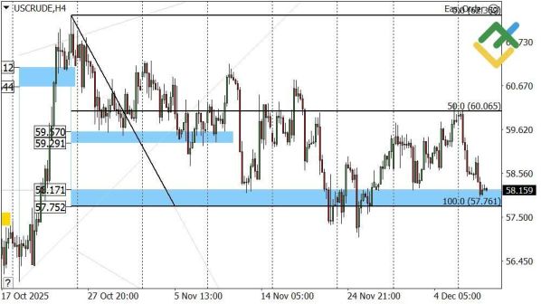 - Нефть (US Crude): цена тестирует зону поддержки 58.17–57.75, сохраняя восходящий краткосрочный тренд.