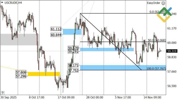 На 20 ноября 2025 года нефть сохраняет краткосрочный восходящий тренд. Вчерашние торги подтвердили устойчивость роста, а ключевая зона поддержки сформировалась в диапазоне 58.17–57.75. Именно отсюда формируются оптимальные условия для входа в длинные позиции.