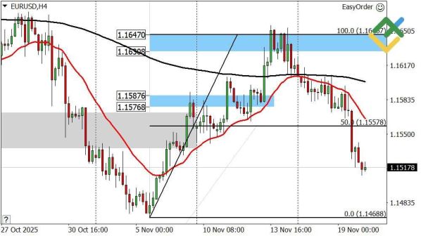 Разворот возможен только при уверенной фиксации цены выше сопротивления 1.1647–1.1630. В таком случае с 21 ноября стоит рассматривать покупки с ориентиром на 1.1825–1.1792.