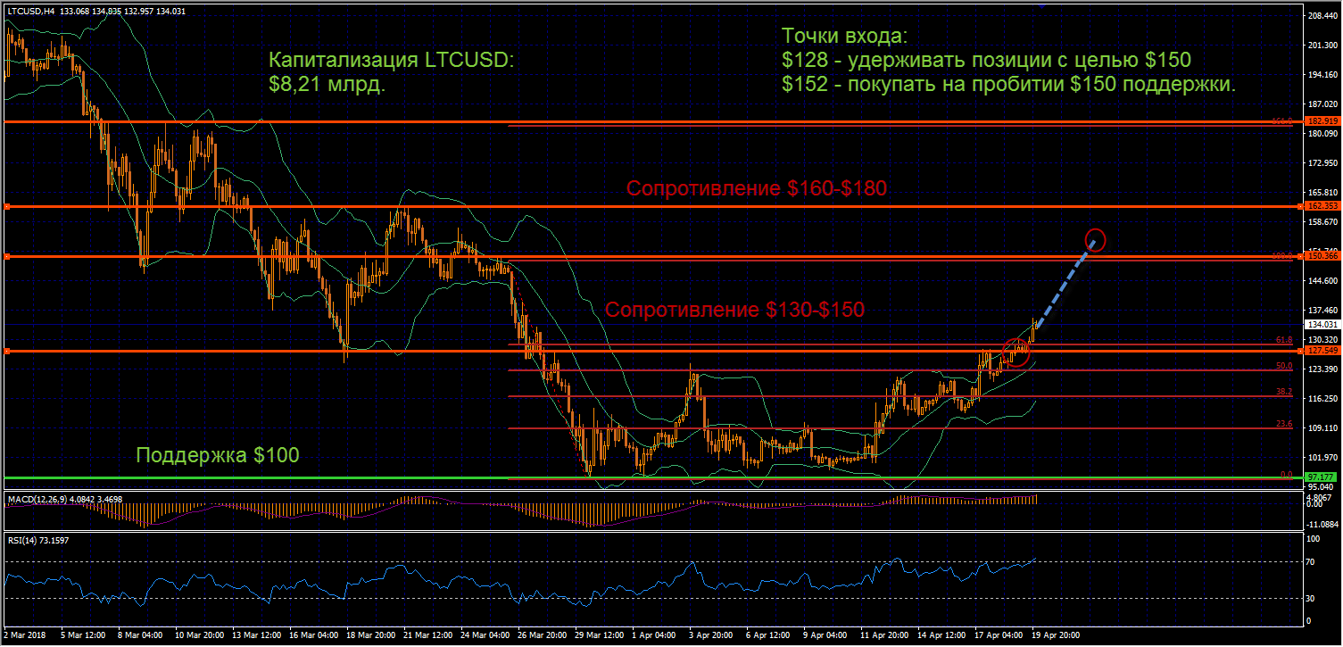 Технический анализ и прогноз криптовалют litecoinLTCUSD сегодня 20.04.2018: Четверг завершился благополучно для покупателей по Лайткоину. На первый взгляд, быкам удалось закрепиться над $127 сопротивлением, которое совпадает с 61,8% Fibo уровнем. Если все-таки удержание текущих отметок подтвердится, то есть все основания полагать, что пара LTCUSD сможет прибавить в цене и к следующим торговым сессиям протестировать диапазон сопротивления $160-$180. Осциллятор RSI гласит о легкой степени перекупленности по монете, MACD также выступает в пользу роста, оставляя скользящие средние выше нулевой отметки. На сегодняшний день мы продолжаем удерживать длинные позиции, открытые на уровне $128 за монету, имея в моменте плавающую прибыль в размере 6 долларов с контракта. Стоит добавить, что в связи с возможным ростом актива видим целесообразной идею по наращиванию лонгов после закрепления уже над следующим уровнем сопротивления — в нашем случае это $150.