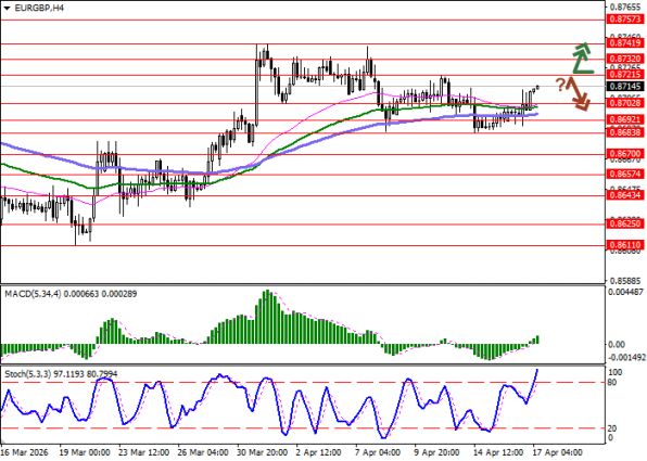 В ходе утренней сессии 17 апреля 2026 пара EUR/GBP корректируется вверх, закрепившись выше отметки 0.8700 и тестируя уровень 0.8715. Европейская валюта завершает неделю в положительной зоне.