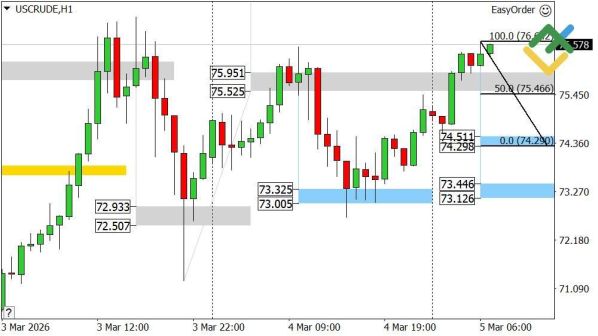 Рынок 5 марта 2026 года встречает умеренным оптимизмом в сырьевом сегменте и давлением на евро. Нефть обновляет максимумы, золото удерживает поддержку, а европейская валюта откатывается после неудачной попытки роста. Разбираем детали и формируем торговую стратегию на основе маржинальных зон и классического технического анализа.