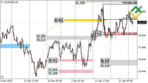 Альтернативный сценарий: если котировки уверенно пробьют поддержку B 59.37–59.09, тренд развернётся вниз. В этом случае открытие коротких позиций будет оправдано с целью на нижнюю зону 56.57–56.01.