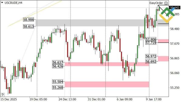 - USCrude: восходящий тренд набирает силу, цена пробила верхнюю целевую зону 58.98–58.61, следующая цель — золотая зона 60.66–60.48.