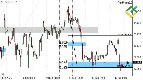 - Нефть (US Crude): котировки находятся в зоне поддержки B (62.43–62.11), которая выступает границей тренда.